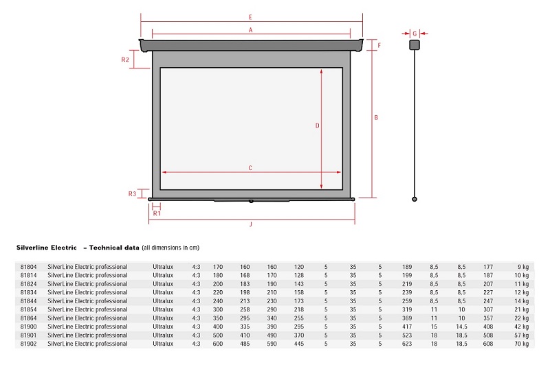 Telas de Projecção Eléctrica 500x410cm - Whiteline GF 4:3 c/ Moldura